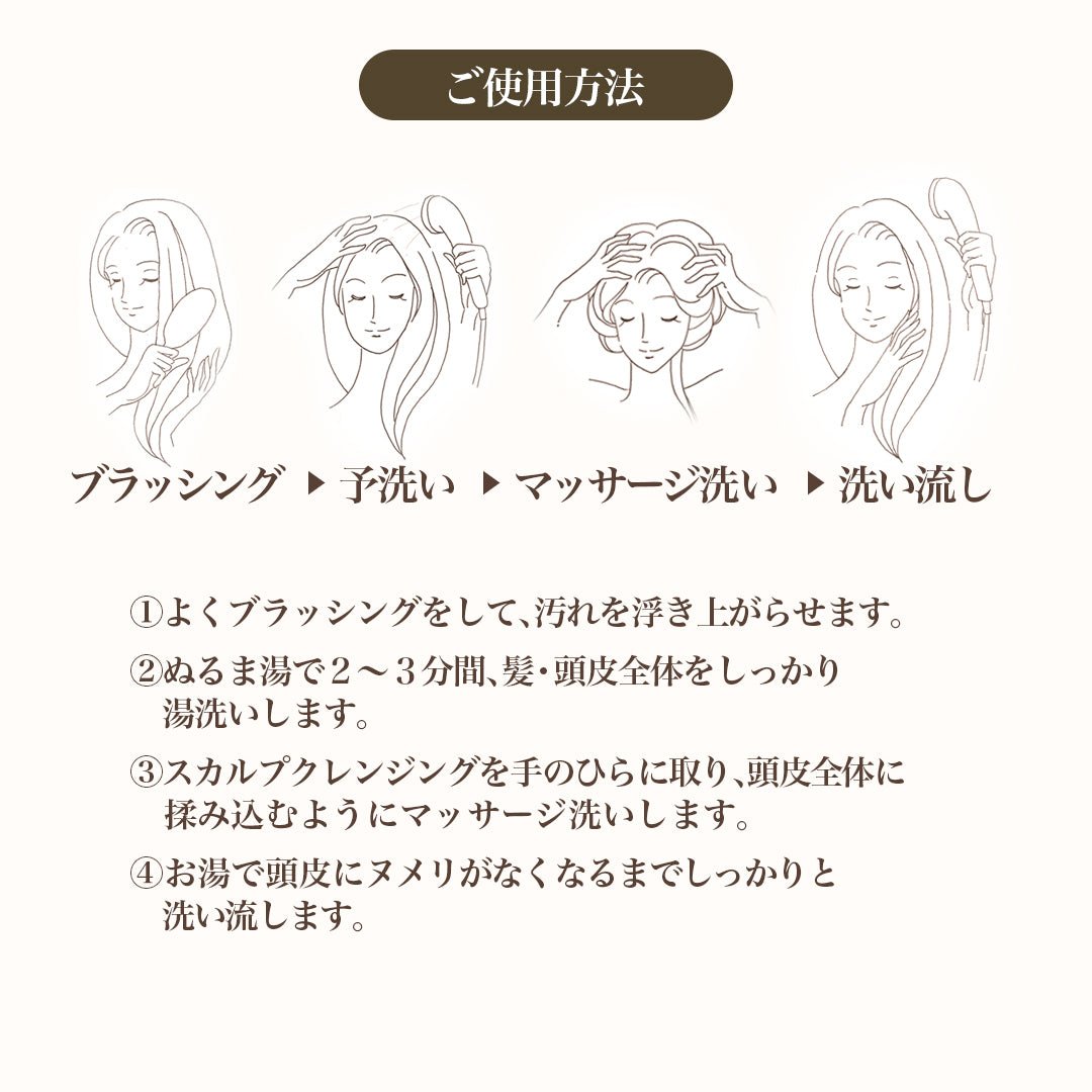 Scalp cleansing: Top with the fresh scent of orange. After that, the gentle yet spicy essential oils of lavender, clove and fennel will follow you, giving you a luxurious time to soothe your scalp and mind.
