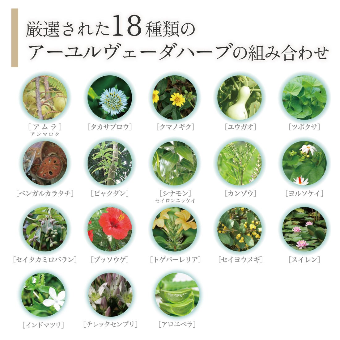 Anmaroku fruit extract, Takasaburo extract, Anemone extract, Moonflower fruit extract, Centella asiatica extract, Indian pine root extract, Bengal oak root extract, Sandalwood extract, Cinnamomum cinnamomum bark extract, Glycyrrhiza stalk extract, Yorusokei leaf extract, Chiletta japonica extract, Black hawk Myrobalan Fruit Extract, Bussouge Leaf Extract, Togevareria Stem Extract, Barberry Stem Extract, Nymphaea Stellata Flower Extract, Aloe Vera Leaf Extract
